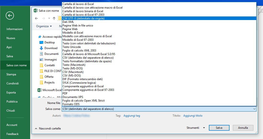 Seleziona “Sfoglia“, e nel campo “Salva come” seleziona “CSV UTF-8 delimitato da virgole“.