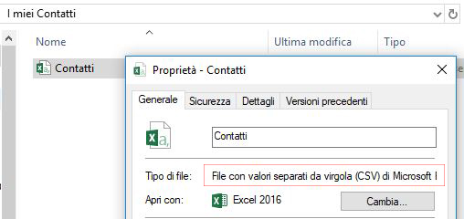 Se hai seguito correttamente i vari passaggi, all’interno della scheda “Generale” il tipo di file indicato sarà “File con valori separati da virgola (CSV)“. Ora il tuo file è pronto per essere usato nella procedura di importazione.